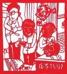 这“钱”不是钱,祭祀完祖先,举行完迎接诸神下凡典仪后,阖家要一起“辞年”,小辈要给长辈叩头拜年祝长辈长寿、大福、大顺,长辈要给小辈红包,即“压岁钱”,压岁钱寓意“压岁祈福”。压岁钱古时称“压祟钱”、“压胜钱”,其最早出现在汉代。压祟钱并非是在市面流通的钱币,而是一种铸成钱币形状的玩赏物,有避邪压魔的寓意,压祟钱原为以红绒绳编起四枚方孔制钱成“方胜”(八宝吉祥图案之一),下垂流苏。那时的一些压岁钱上,正面多铸有“长命百岁”、“去秧除凶”、“万岁千秋”等吉祥语,其背面多是龙凤、龟蛇、双鱼等祥瑞图案。压岁钱是过大年时的风俗,是一种美好的祝愿,如今虽然货币更迭,但长辈给小辈压岁钱之民俗依旧在过年之时传承着,其寄予了长辈对少儿们成长的美好祝福,祝福孩子们健康成长。